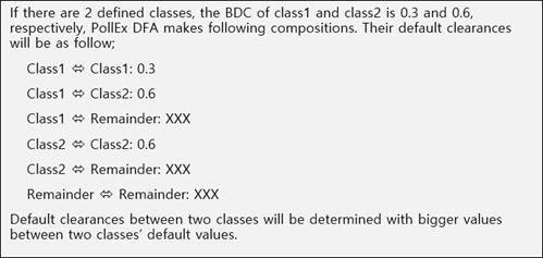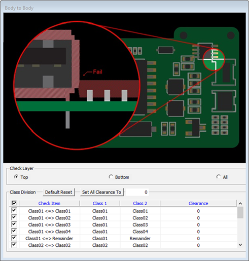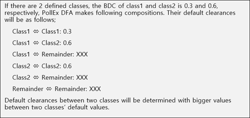 This item checks the clearance between component body and body. The measurement base is 3D package’s body surface to another components’ body surface. Checking is performed for the classes’ compositions which are automatically created by PollEx DFA. Applied clearance values are BDC (Body Default Clearance) values that you input while making each class. You also can change this value.