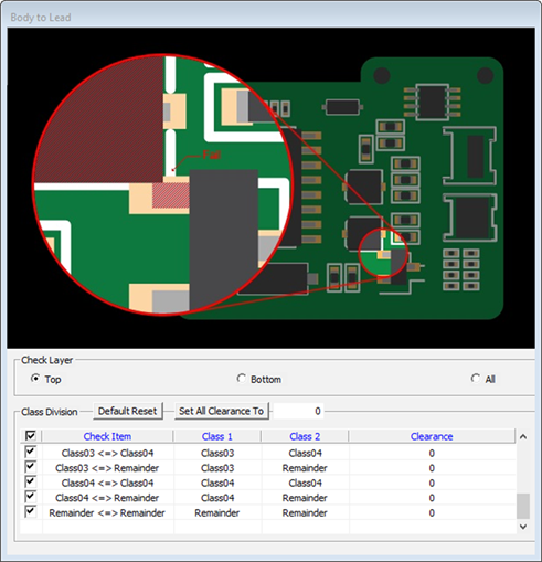 This item checks the clearance between component body and component leads. Measurement base is 3D package’s body surface to another packages’ lead. Checking is performed for classes’ compositions which are automatically created by PollEx DFA. Applied clearance values are BDC (Body Default Clearance) and LDC (Lead Default Clearance) value that you input while making each class. You also can change this value.