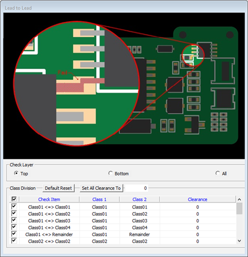 This item checks the clearance between component lead and component leads. Measurement base is 3D package’s lead to other packages’ leads. Checking is performed for classes’ compositions which are automatically created by PollEx DFA. Applied clearance values are LDC value that you input while making each class. You also can change this value.