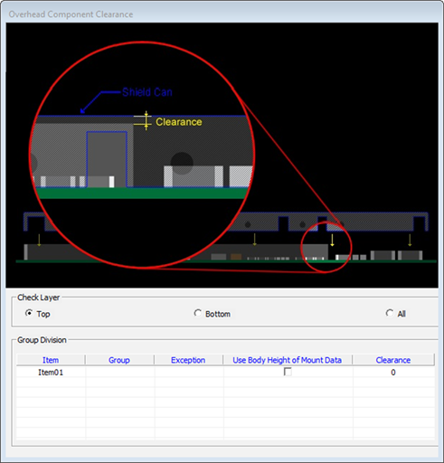 Engineers use overhead components such as Shield-Can, Heat-sink and Basket to protect weak components from electro-magnetic. There is an overhead component with covering below the component. If both are too close together, both will be touched. And then, some problems might occur. This item checks the gap between the overhead component and the below component.