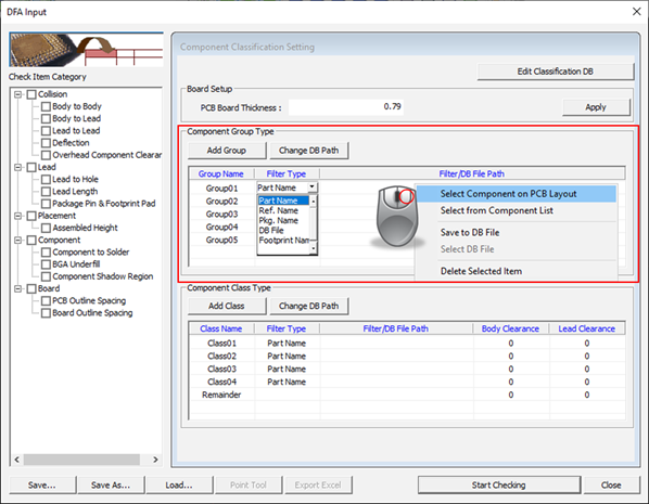 Make the GROUP that will be the target groups for different checking items. You can make grouping for components that have the same properties. There are three types of grouping methods: directing component selection on PCB design, selection from component list, and importing DB file, *.txt.