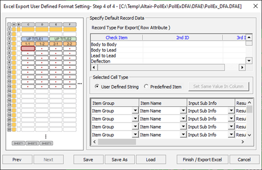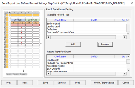 - The same number of columns you selected in Record Type For Export appears here. Select the columns you want and choose or define the contents you wish to provide initially. With Record Type For Export of Selected Cell Type, you directly enter the category you want to use. With Selected Cell Type, a combo box appears as seen below, and you should select and use the category, by recording the required category determined by the information gained from ECAD interface and DFA. Therefore, using Selected Cell Type is useful in terms of convenience and accuracy.