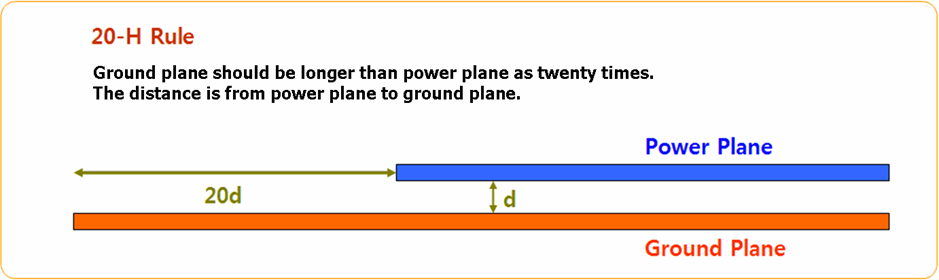 • Extend the ground plane about 20 times of the layer spacing (H) between the power plane and ground plane from the edge or power plane.