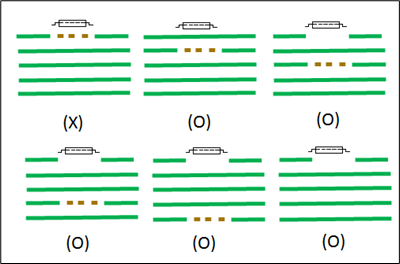 • Inductance Fill Cut: Check if fill-cut exists under the IC. If some signals exist under the IC, the ground plane should exist between signal layer and IC placement layer.