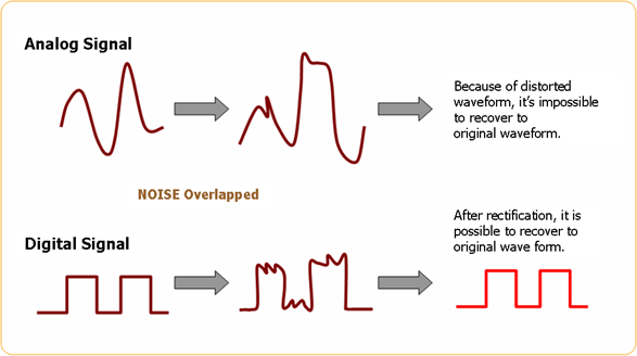 Because analog signal handles change of magnitude in signal, if noise is overlapped