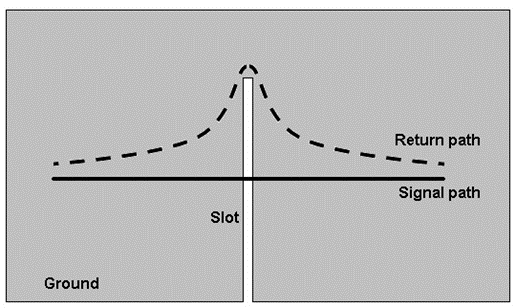 Return path is the shortest when signal trace is tightly shielded by solid ground plane below or by coplanar ground. However, any discontinuities, such as slots, gaps, holes and split planes, along the shortest return path makes the current to go around the discontinuities.