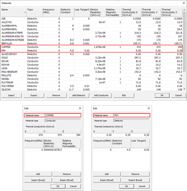 By double-clicking a certain material in the Materials dialog or selecting and then clicking Edit, the material properties can be modified. Clicking Add Dielectric or Add Conductor opens the Edit dialog with empty values.