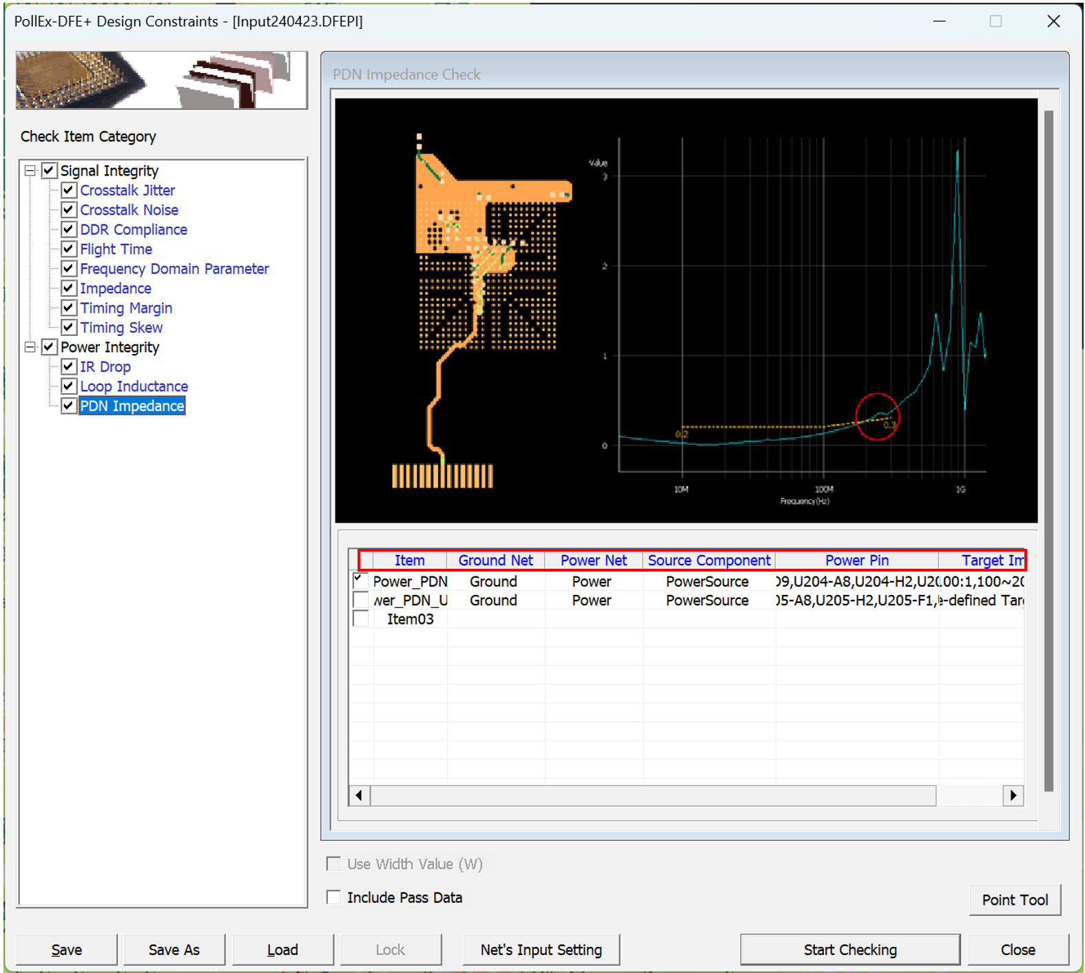 This item checks whether the PDN Impedance of the specified Power pins are higher than the target impedance specified.