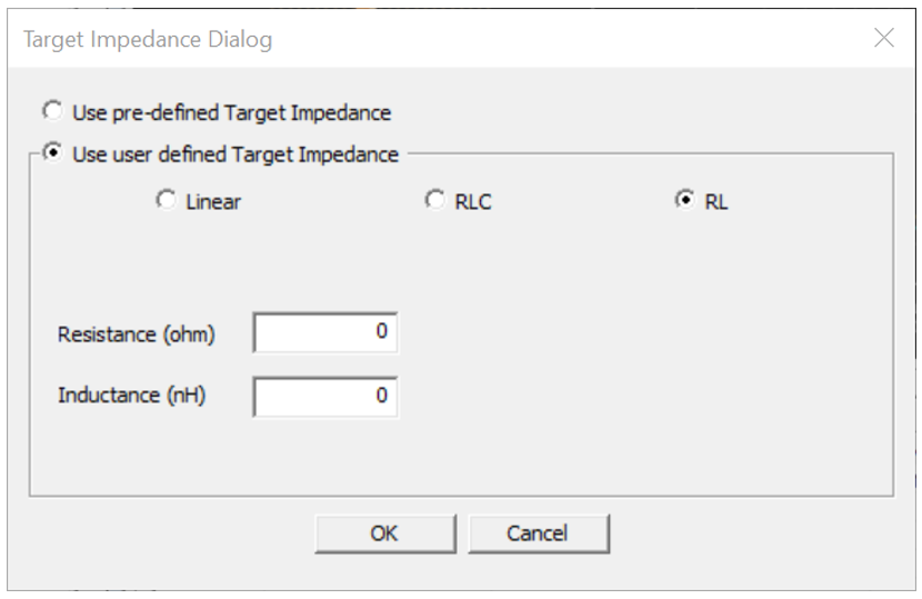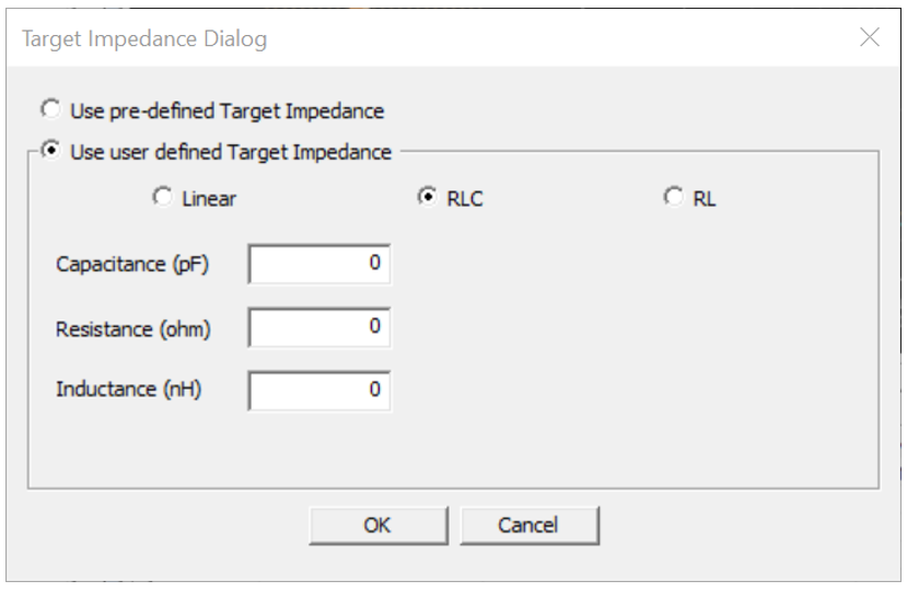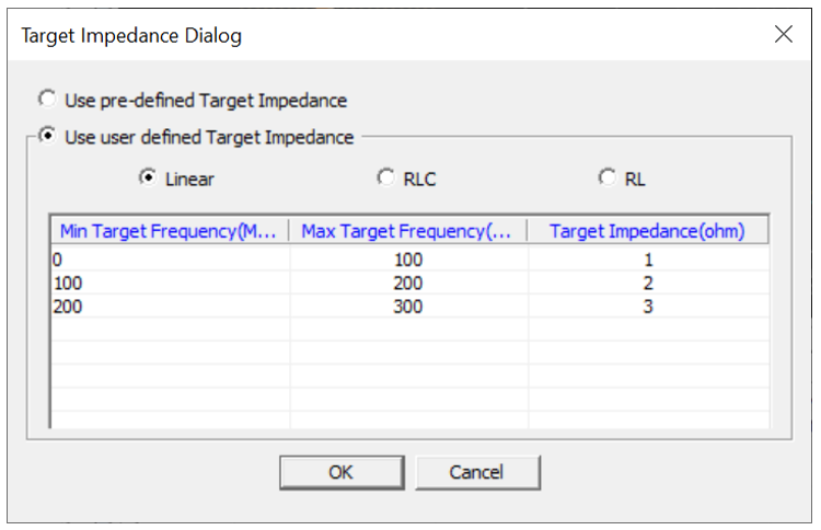 can arbitrary set allowable Target Impedance value. There are three types way to set up the target impedance: Linear, RLC and RL.