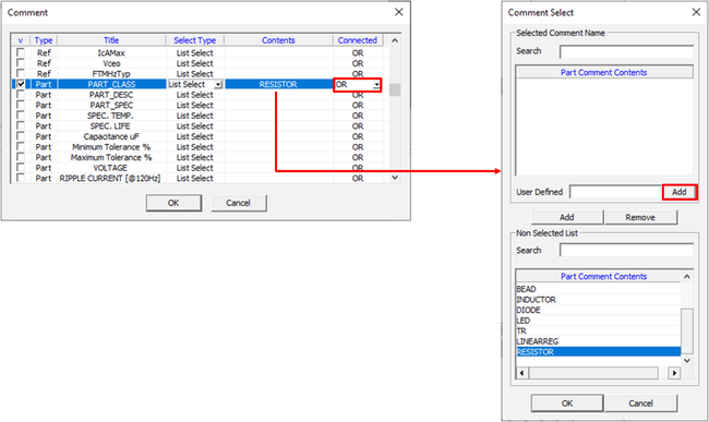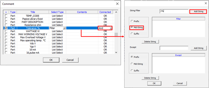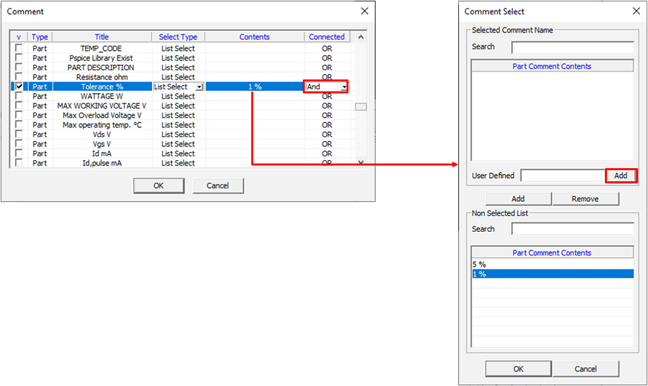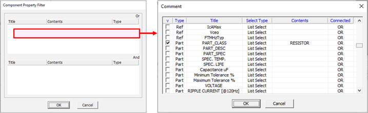 • Comp Filter: Set component property. The DFE considers the component using this property among components of component group as a target component. For example, if we want resister has 1% tolerance, to choose properties, 1% and RESISTOR, use AND combination to get components from list. If you select Filter and Select Type column, you can select property using character string. When an empty raw (red colored) is double-clicked, a component dialog will be displayed. For example, if you specify text with IC and filter type with Prefix, program selects all components which have that portion of string as prefix. If components with a suffix NC need to be excluded, use the Except section. You can make and condition by using Add and Combinations. Components can be added to a group by using their properties or comments. For example, to choose properties, 10Kohm and Resistor, use AND combination to get components from list. If you select Filter at Select Type Column, you can select components using string filter.