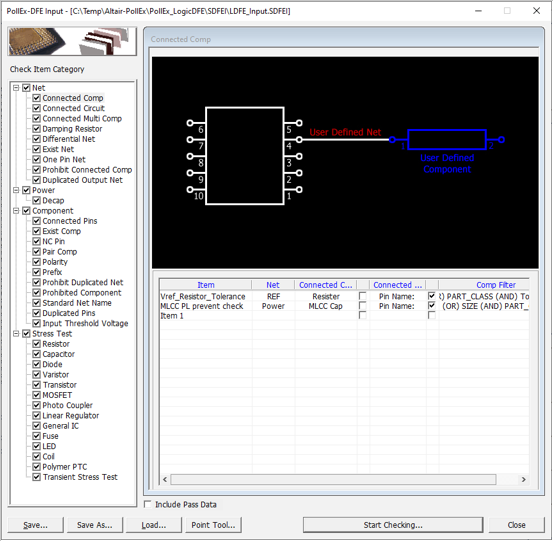 When a trace has noise or EMI problem or it is very weak against ESD, you may not have any other routing option to resolve the problem. In such case, special purpose components, such as shunts, beads, damping resistors and filters, may be used. If those components are used in circuit, this DFE rule checks whether they are connected.