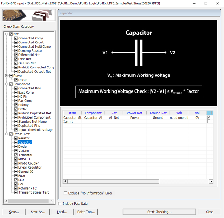 This item tracks the voltage and signal lines in the circuit, calculates the voltage value of each net, and checks whether the all capacitor connected to the net is within the allowable voltage range.