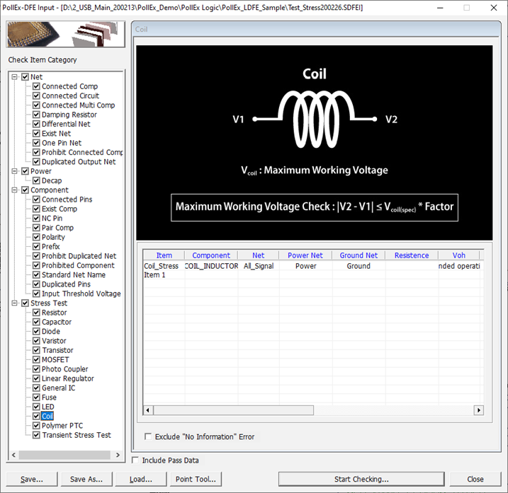 This item tracks the voltage and signal lines in the circuit, calculates the voltage value of each net, and checks whether the all coil connected to the net is within the allowable voltage range.