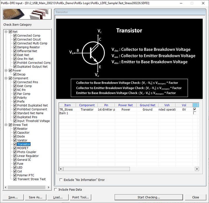 This item tracks the voltage and signal lines in the circuit, calculates the voltage value of each net, and checks whether all Transistor connected to the net is within the allowable voltage range.