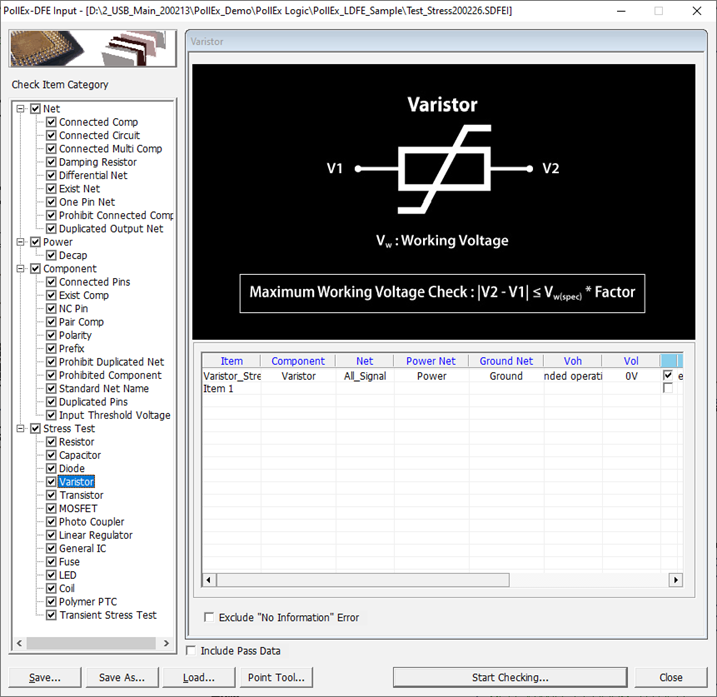 This item tracks the voltage and signal lines in the circuit, calculates the voltage value of each net, and checks whether all varistor connected to the net is within the allowable voltage range.