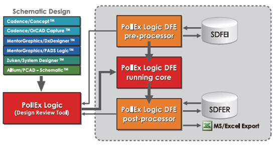 PollEx Logic DFE is a toolset that checks electrical validity and standardizing of schematic design.