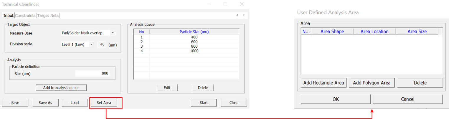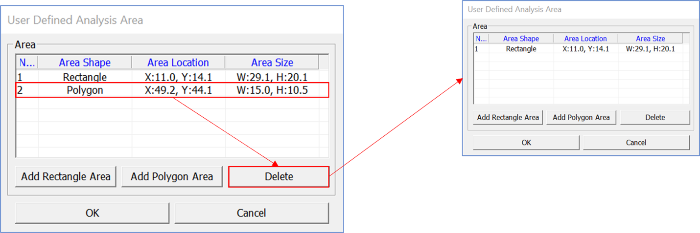 - Delete – Deletes an added area.From the User Defined Analysis Area box: