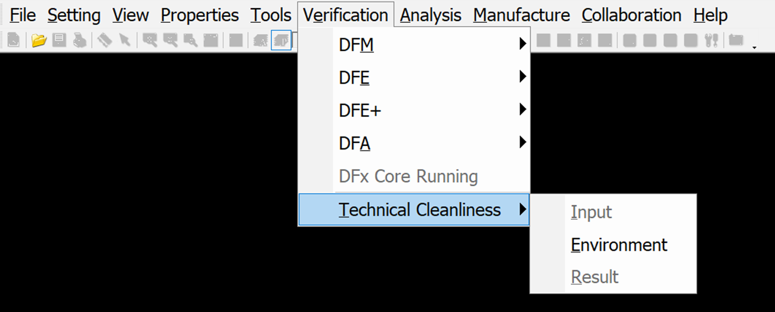 Technical Cleanliness has three sub menus: