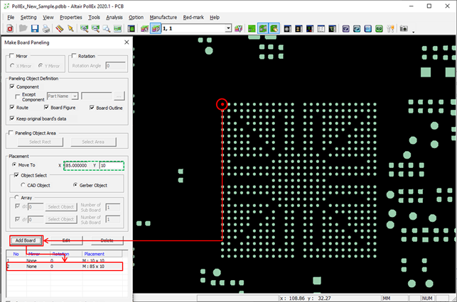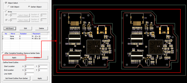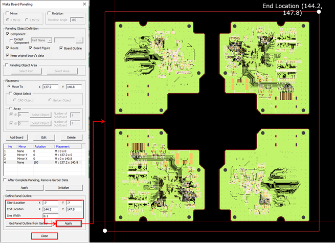 Make Board Paneling is a function to modify the data designed with a single sub board into an array type to use manufacturing related features such as Metal Mask Manager, Mounting Emulator, Block JIG Generator, Router-Machine JIG Generator, and so on.