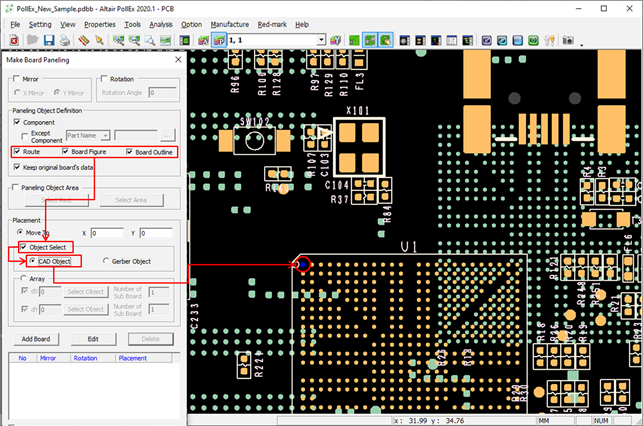 - In the Paneling Object Definition section of the Make Board Paneling dialog, enable the following checkboxes: Route, Board Figure, and Board Outline.