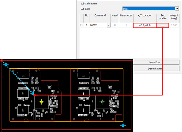 The nozzle of the underfill dispenser moves from (40.0,42.0) to