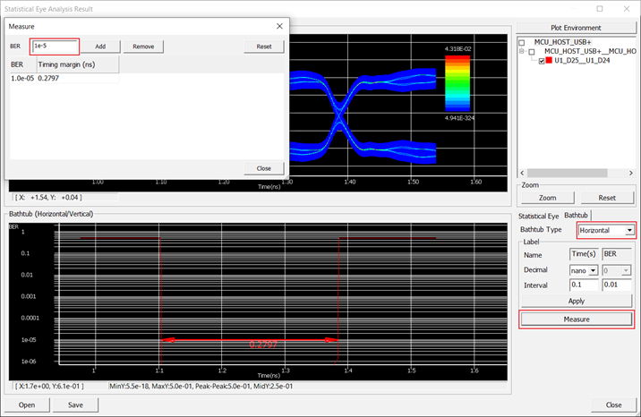 The result value is 0.2797 (ns) in this case and it also shows the distance mark at the bathtub curve in the Statistical Eye Analysis Result dialogue.