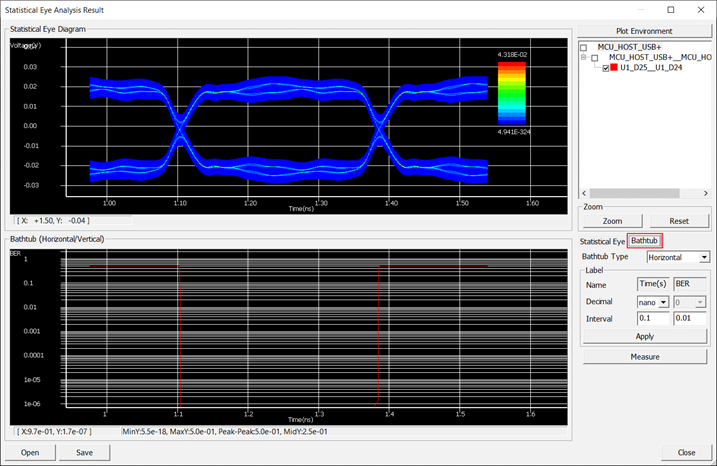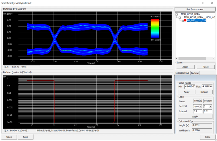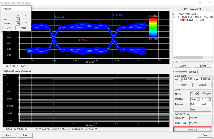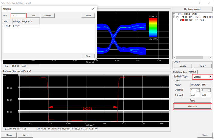 The result value is 0.0372 (V) in this case and it also shows the distance mark at the bathtub curve in the Statistical Eye Analysis Result dialogue.
