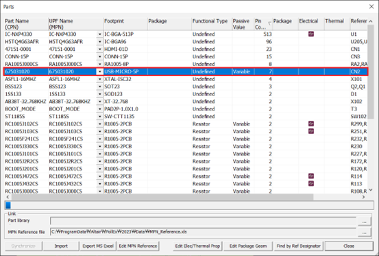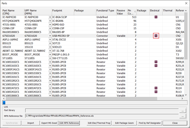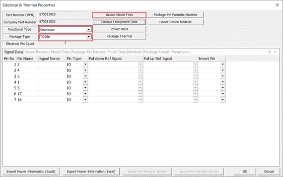 The connector’s part properties are assigned automatically, as shown in the Electrical & Thermal Properties dialog.