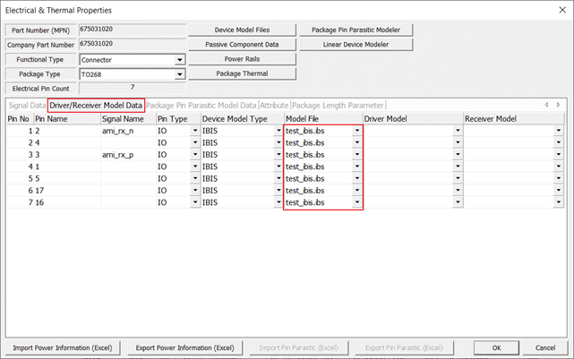 By selecting one of the tab menus among Signal Data, Driver/Receiver Model Data, Package Pin Parasitic Model Data, and Attribute, detailed information displays.