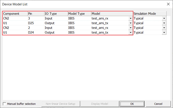 This is the Driver/Receiver Model Data tab menu. The model file name in the red box changes depending on the IBIS model.Figure 8.