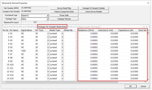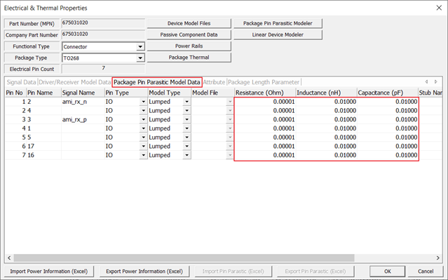 This is the Package Pin Parasitic Model Data tab menu. The parasitic values in the red box vary depending on the IBIS model.