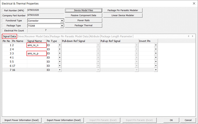 By selecting one of the tab menus among Signal Data, Driver/Receiver Model Data, Package Pin Parasitic Model Data, Attribute, and Package Length Parameter, detailed information displays.