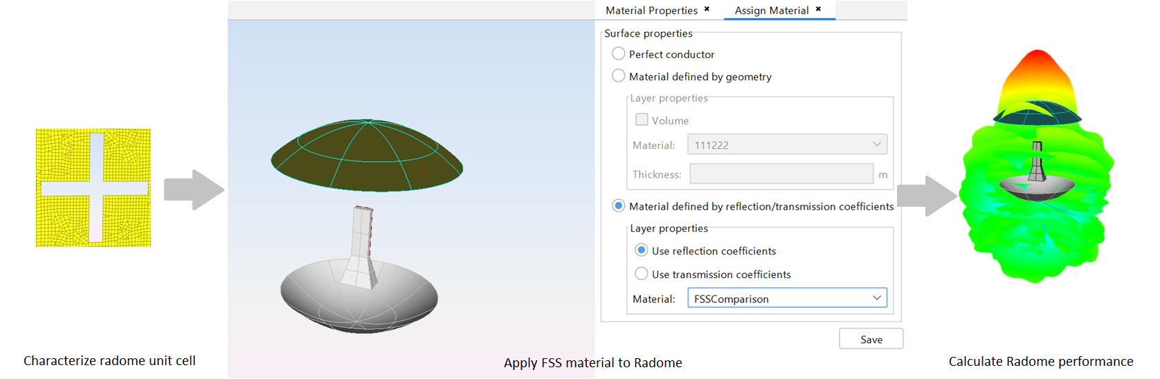 Figure 4. The new workflow for accurate and fast characterisation of multi layer radomes with FSS performance based on pre-characterisation of the radome and FSS as a material.