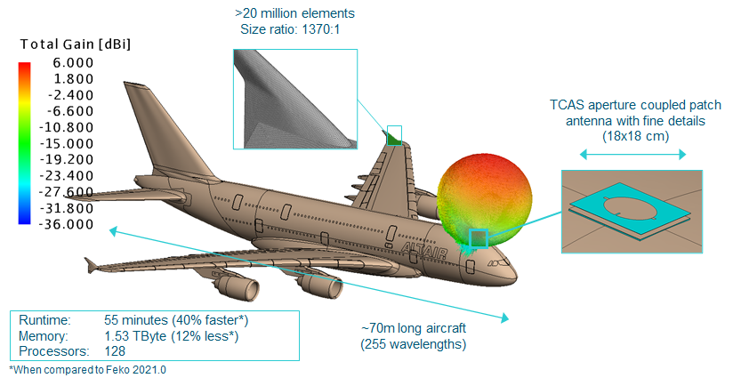 Figure 2. Simulation of the installed performance of a traffic collision avoidance system (TCAS) antenna using distributed MLFMM illustrates the improvement in parallel efficiency when comparing Feko 2022 with Feko 2021.