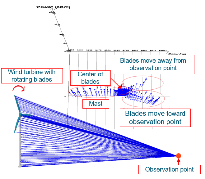 Figure 3. Calculation of Doppler shift due to the rotation of the blades of a wind turbine.