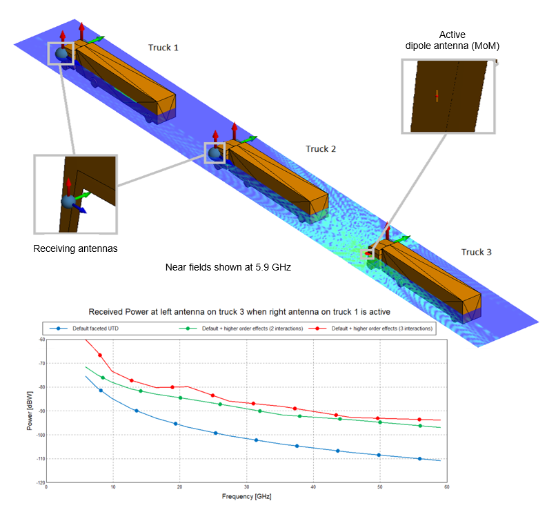Figure 1. Faceted UTD coupled with MoM used to analyse the field distributions and antenna coupling for rear-view mirror mounted communication antennas in a set of platooning trucks at different frequencies. Multiple interactions and the inclusion of higher-order effects result in more accurate calculation of coupling between certain combinations of antennas.