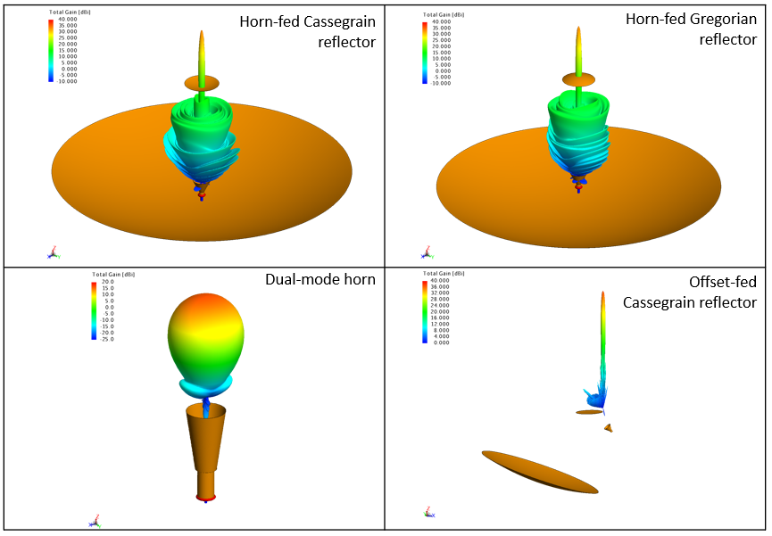 horn-fed reflector antennas as well as a dual-mode horn which may be used to provide more