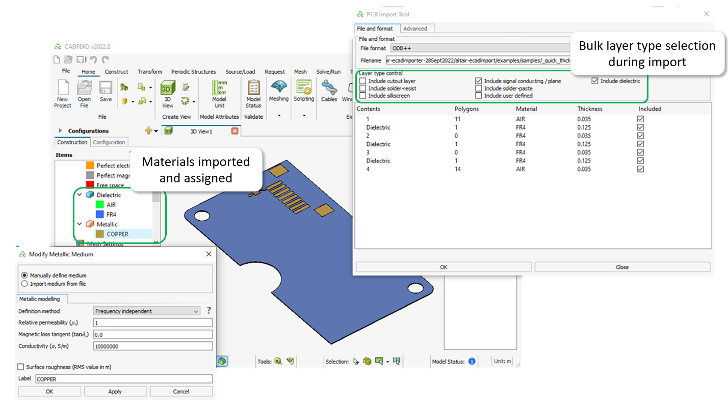 Figure 3. During import of PCB formats materials are included and assigned. In addition bulk include/exclude of layer types is supported.