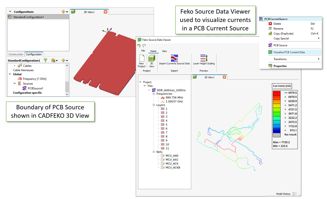Figure 4. Viewing the boundary of a PCB Source and using the Feko Source Data Viewer to view the currents included in a PCB source at a chosen frequency.