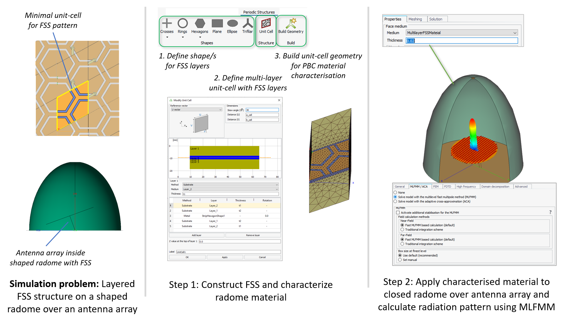 Figure 1. A streamlined and flexible workflow for simulation of multi-layer FSS radome structures using material characterisation with PBC and MoM/MLFMM.