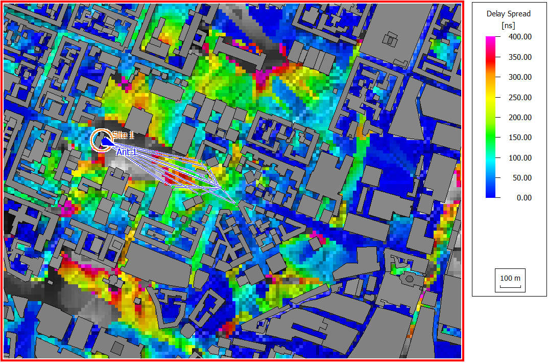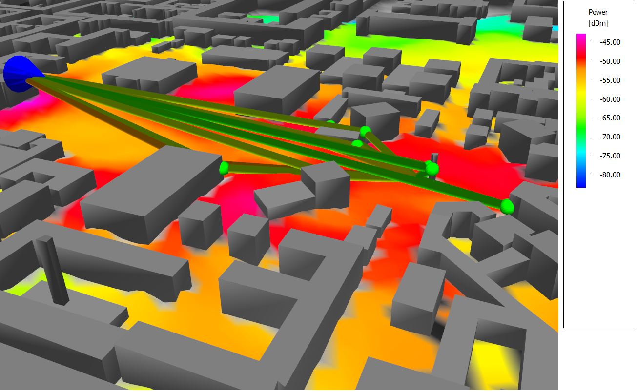 The propagation results show at every location the power received by a hypothetical isotropic receiver as well as several other quantities of interest. When viewing the power, you can select to display the rays and observe how a point of interest is reached by several rays that have undergone reflections and diffractions, see Figure 1.