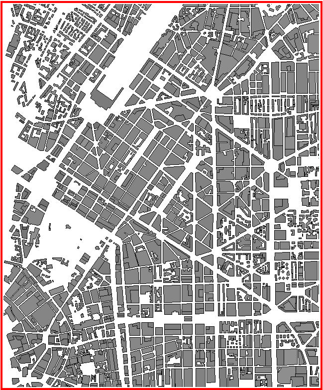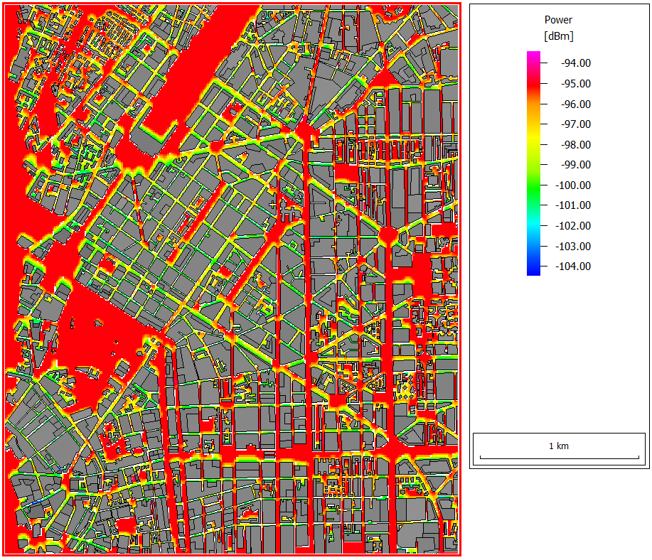 Propagation results show at every location the power received from the transmitting antenna by a hypothetical isotropic receiver. The transmitter is located south of the city as the buildings cast shadows northward.