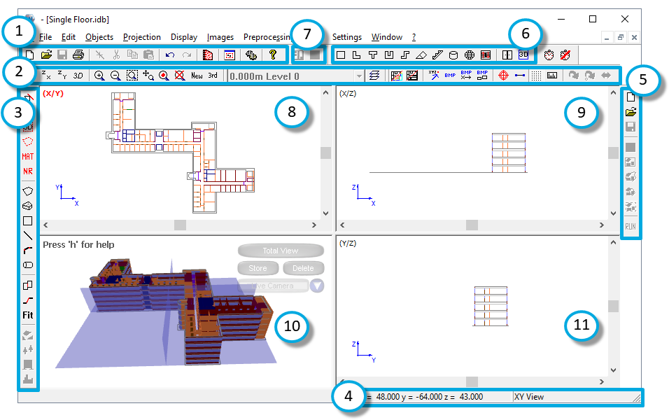 - The Status bar is a small toolbar that gives quick access to absolute coordinates at the location of the mouse cursor in the 2D view and also displays the currently active 2D window.