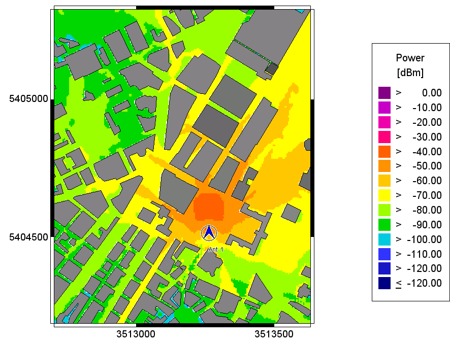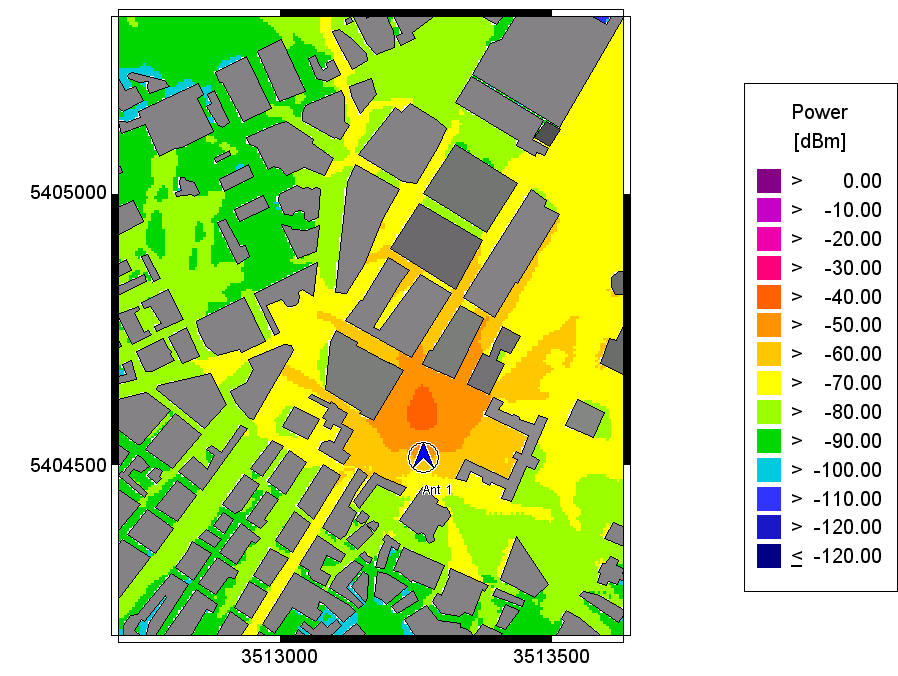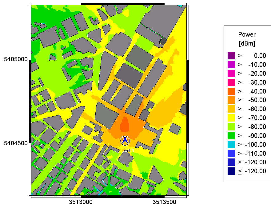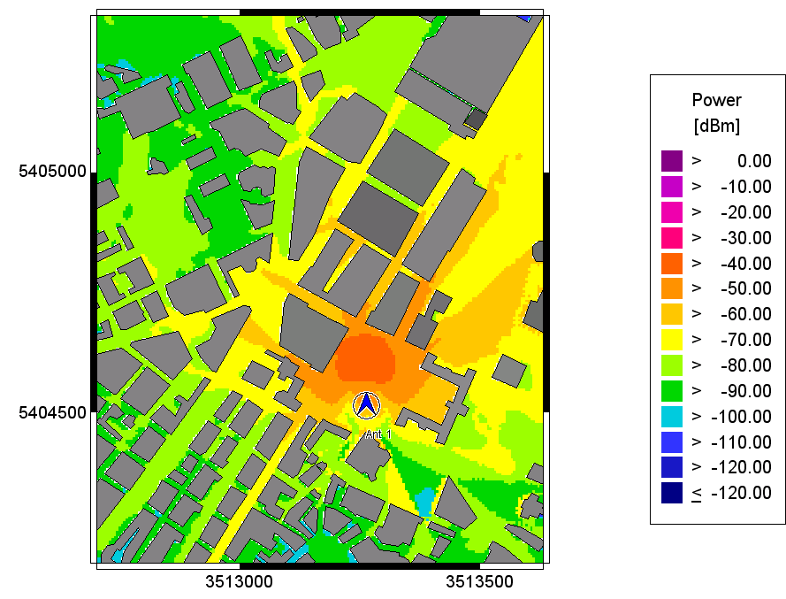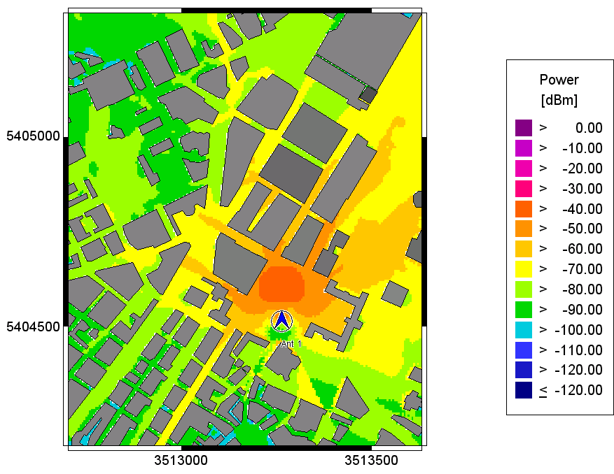 The plots of the predicted received power for the transmitter height of 20m show the influence of the antenna pattern on the wave propagation results. When comparing the different power plots there are some differences visible, especially concerning the main lobe and the side lobes.