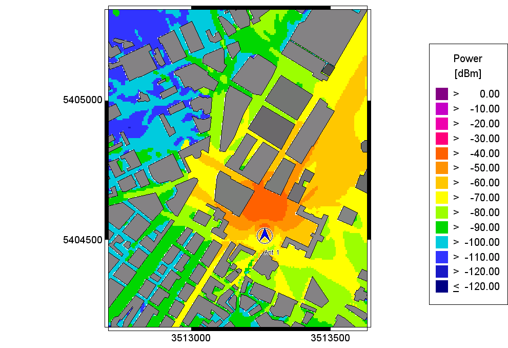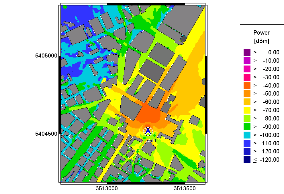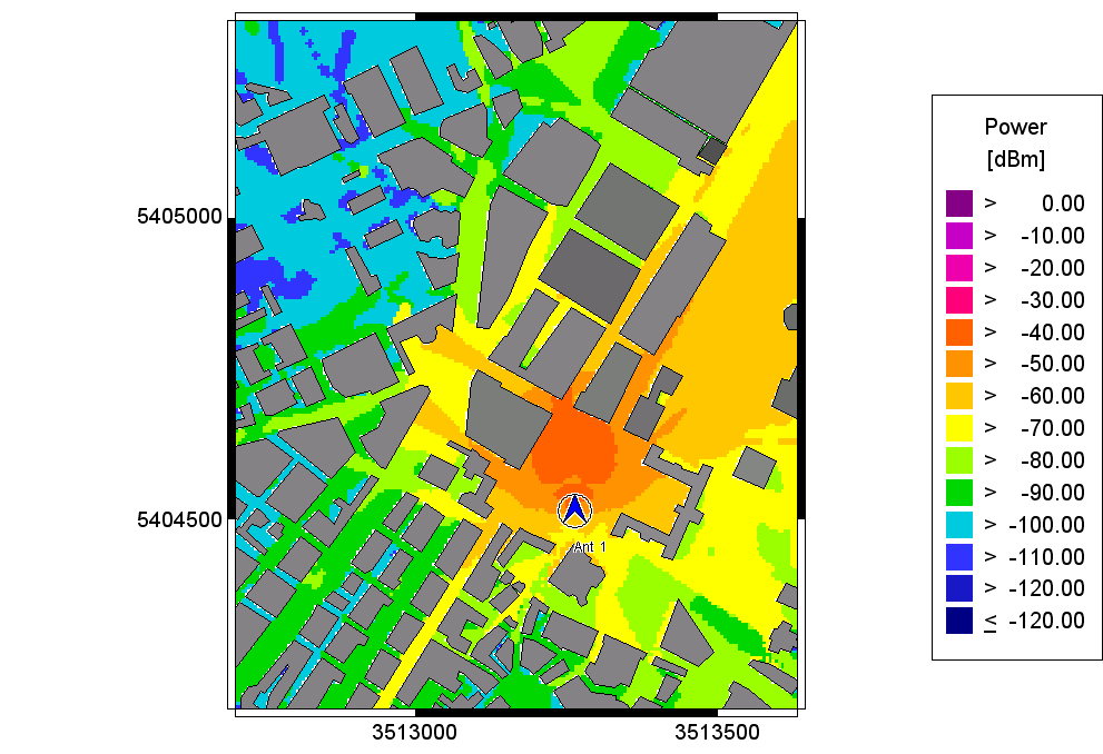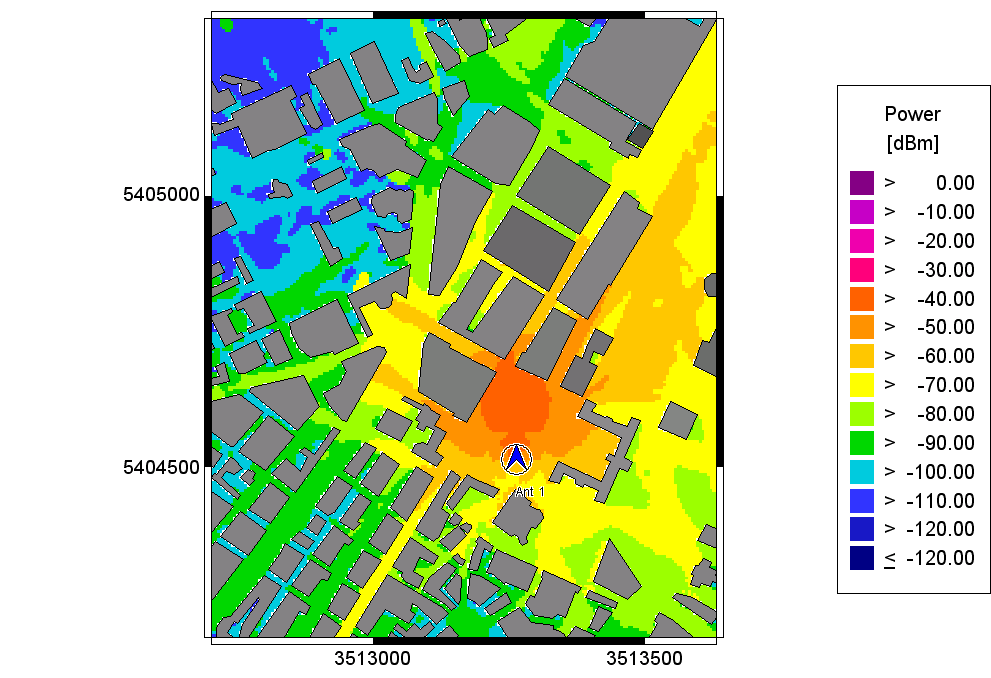 The plots of the predicted received power for the transmitter height of 10m show the influence of the antenna pattern on the wave propagation computation. Also for this reduced transmitter height, all the figures look very similar, however after detailed analysis, there are some differences visible.