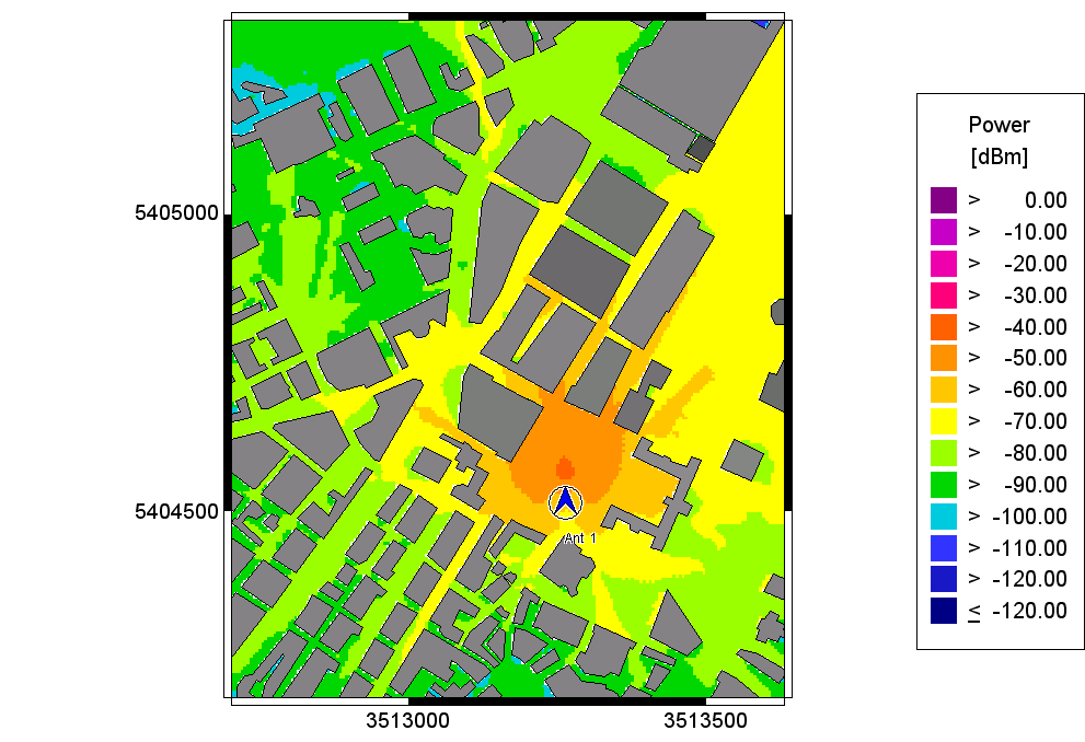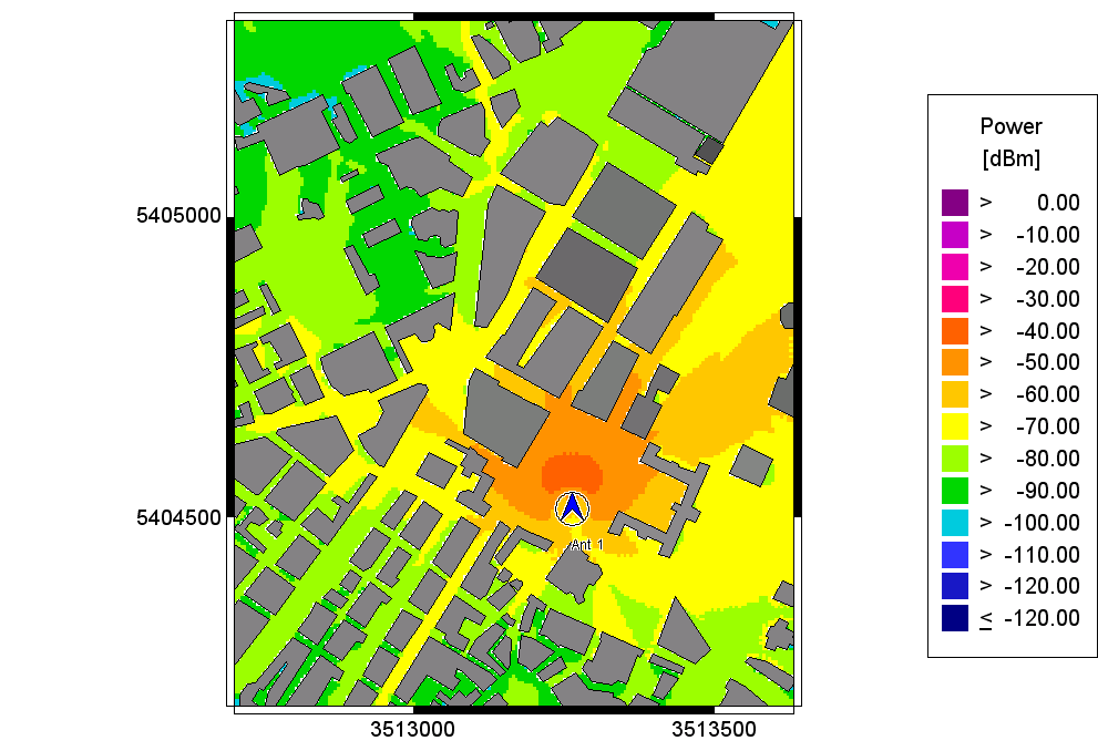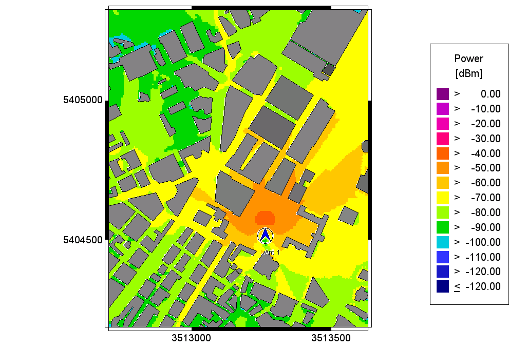 The plots of the predicted received power for the transmitter height of 20m show the influence of the antenna pattern on the wave propagation computation. When comparing the different power plots, there are some differences visible concerning the main lobe and the side lobes.