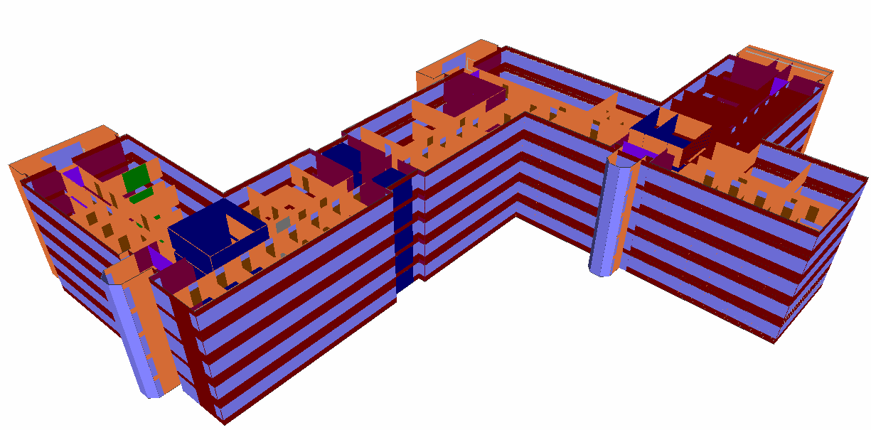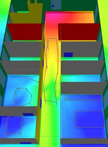 Indoor scenarios have the most detailed geometry descriptions, with exterior walls, windows, interior walls, doors, and whatever else is relevant. Object dimensions are typically much larger than a wavelength, since WinProp uses high-frequency and empirical methods.