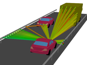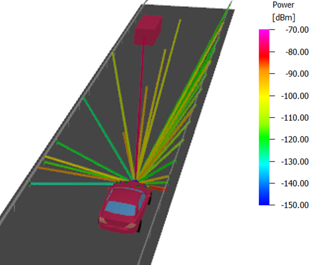 A useful option for automotive-radar simulations is to import patterns of monostatic radar cross section (RCS) from Feko. This can save simulation time and improve accuracy. The complicated reflecting object in WinProp can be replaced by a simple object plus the RCS information, see Figure 3.