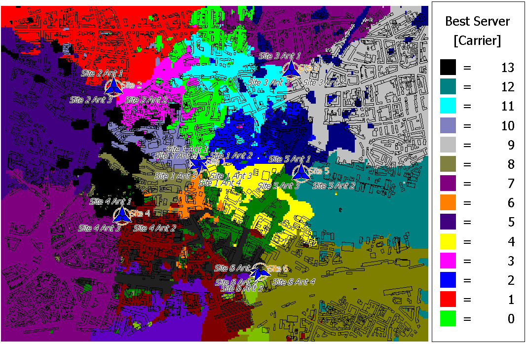 Network analysis is instrumental in planning the locations of the base stations. One of the standard results is a map of which transmitter serves which area, and, for any receiver location, the number of transmitters, carriers and sites can be received. The latter is instrumental in visualizing hand-over options.