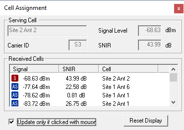 The additional information about the cell assignment, such as serving cell, received signal level and signal-to-noise-and-interference-ratio is displayed in the Cell Assignment dialog after clicking on a receiver pixel with the mouse. Besides the serving cell (S), the links to the other received cells (AS), or all cells of the network (AS and NR), are listed in the lower part of the dialog.